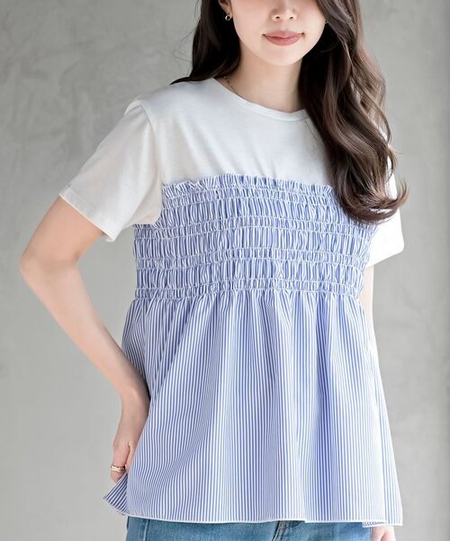 ☆2026/SS 再入荷☆ シャーリングで女子力高まるドッキングトップス くしゅくしゅとした胸元が大人可愛いトップス。 Tシャツにビスチェを重ねたようなレイヤードが楽しめる1枚です。 ふわっと広がるフレアシルエットが体型カバーにも◎。 1枚でコーデが映える存在感のあるアイテムです。 ※再入荷の場合、生産時期が異なるため色・素材・サイズ・デザイン等多少異なる場合がございますので予めご了承ください※アイボリーとチャコールは透け防止のためTシャツに重ねてあり、ブラックとチャコールは透けにくいため胸元で切り替えてあります。 色ごとで仕様が異なりますが予めご了承ください。 裏地なし カットソーのみ伸縮性あり 薄手 胸元ゴム仕様 洗濯:洗濯機使用可(ネット使用) ▼お気に入り登録でお得がいっぱい▼ ~商品をお気に入り登録~ 再入荷・ラスト1点などの通知を受け取ることができます! ~ブランドをお気に入り登録~ 《rps》の新商品・再入荷情報をいち早くお届け!