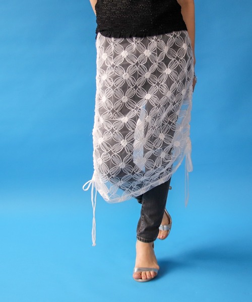 レイヤード次第で何通りものスタイリングが楽しめるシアースカート。チュール素材の透け感が軽やかなスタイリングに。 刺繍はフラワーモチーフでぐっと華やかな印象に。 スッキリとしたシルエットで、大人っぽい着こなしになり、プラスワンで個性的なコーデに。デニムパンツの上からサラッと、カジュアルなロゴTやフーディ合わせで抜け感のあるコーデに。オーバーサイズのトップスを合わせて、メリハリのあるコーデもこなれ感があります。スラックスやジャージ、スカートとのレイヤードで今時なスタイリングに。--------------------------------------透け感:あり裏地:なし伸縮性:ややありケア方法:手洗い可※お洗濯の際は洗濯表示を必ずご確認ください。--------------------------------------