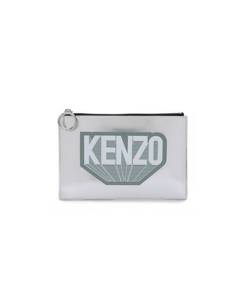 Rubber logo lettering details the front of a slim, metallic leather KENZO clutch. Zip top and lined interior. Dust bag included. Leather: Calfskin. Weight: 4oz / 0.11kg. Imported, China. Measurements Height: 6in / 15cm Length: 9in / 23cm