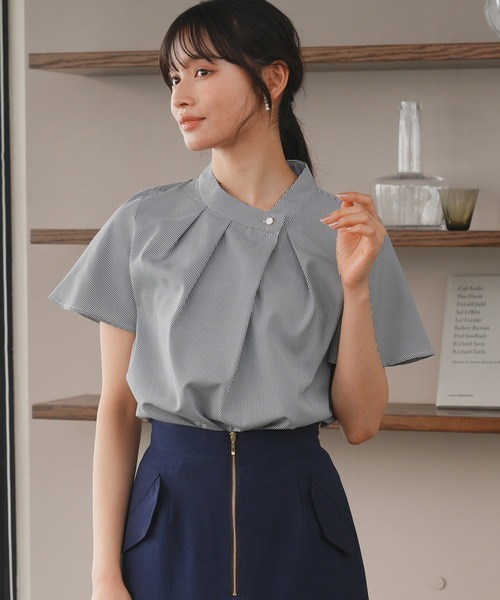 細めストライプで着回し力抜群の万能アイテム。 人気のアシメネックシリーズの爽やかなストライプ柄がリリース。 オフィスでも使いやすい細めのストライプ◎ 1枚で着るシーズンも安心の透けにくい配色がポイントです。 やや短めの着丈なので、パンツなどと合わせたアウトスタイルもすっきりとしたバランスでお召しいただけます。 ベーシックな配色になっており、スーツのインナーにもピッタリ。カラーボトムとの相性も抜群です。