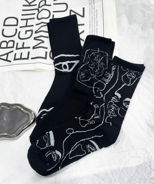 ユニークな抽象画がおしゃれ。3枚組セットの靴下。※お使いのモニター環境によって色合いや風合いが違って見える場合がございます。サイズ:FREE