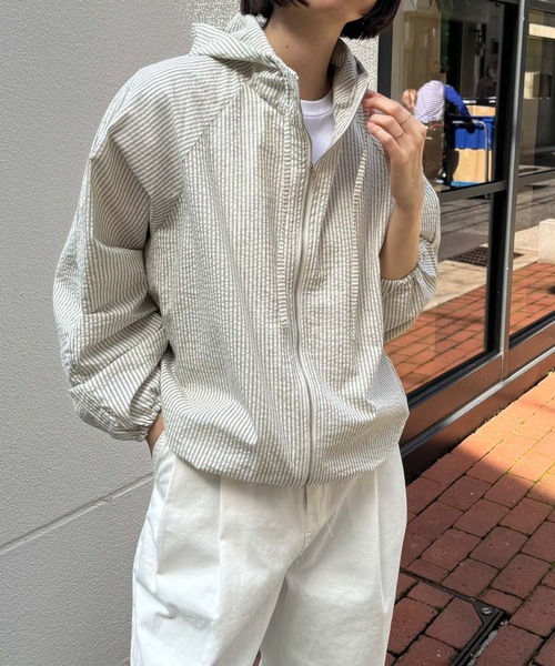 デザイン ストライプ柄が爽やかなパーカーブルゾン。 ラグランスリーブが肩周りをスッキリ見せてくれます。 素材 サッカー地のストライプで、軽やかな着用感が今からの季節のライトアウターにぴったり! コーディネート トップスとしても羽織りとしても優秀な一枚。 丸みのある女性らしいフォルムとコンパクトな丈感でどんなボトムとも相性抜群です。 El mar(エルマール) El mar はスペイン語で『海』 海に向かうときはだれでもワクワクする。 洋服を選ぶとき、袖を通すとき、 同じように心が踊るアイテムを提案したい。 そんな『ワクワク』な気持ちを込めて El mar はデビューしました。 ------------------------------------- 生地の厚さ:厚い〇〇〇●〇薄い 伸縮性:あり 透け感:なし 裏地:なし 光沢:なし 水洗い:可 ・袖、裾口ゴム仕様 ------------------------------------- 取扱い:手洗い 濃色は色落ちする可能性がありますので、他の物とのお洗濯はお避けください。 蛍光増白剤の入っていない洗剤をご使用ください。 長時間の水への浸漬はお避けください。 洗濯後は速やかに形を整えて陰干しをしてください。 水洗いの後の乾燥機のご使用はお避けください。 この商品は素材の特性上、ピリング(毛玉)が出る場合がございます。 クリーニングネットを使用してください。 アイロン掛けの際は、あて布をご使用ください。 ※取り扱い及びお手入れ方法については、商品について取扱表示、洗濯表示にてご確認下さい。 ※照明の関係により、実際よりも色味が違って見える場合があります。またパソコン・スマートフォンなどの環境により、若干製品と画像のカラーが異なる場合もございます。 ※商品の色味は、商品アップ画像をご参照ください。