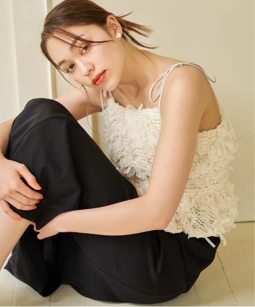 ーーーチュールのフリンジがポイントのキャミビスチェーーー■point・細かいチュールのフリンジがポイント・ストレッチ性のあるニット生地・華奢見えする細めなリボンストラップ・ウエスト部分がシェイプしていてペプラムデザイン・レイヤードしやすいコンパクト丈■stylingTシャツやカットの上から着るのがおすすめです。ウエストがシェイプされたすっきりデザインなのでフレアスカートやワイドパンツとの相性も◎1枚着としてインナー使いも可能なので上からジャケットやカーディガンを羽織ったスタイリングもおすすめです。※屋外の光や照明の当たり具合で、実際の商品の色味とカラー別画像の色味に若干の違いが発生する場合がございます。 詳細画像と併せてご確認の上、ご注文いただきますようお願い致します。【INFORMATION】■商品のお気に入り登録完売していても再入荷時に再入荷通知を受け取ることができますので、是非ご登録ください!■ブランドのお気に入り登録新商品や再入荷などの情報を受け取ることができますので、是非ご登録ください!