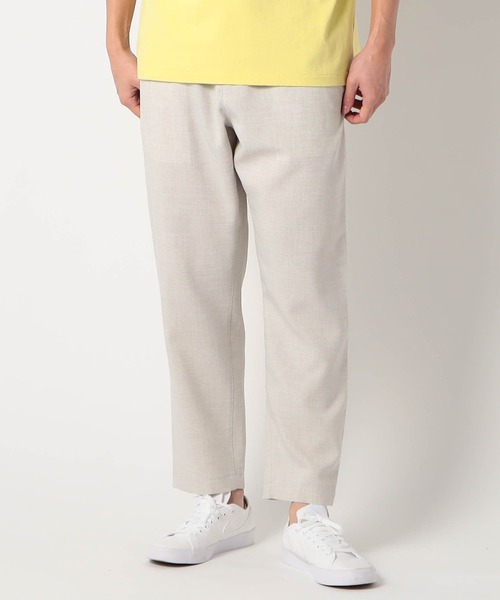 清涼感のある麻のような表面感肌触りをイージーケア素材で作った夏に大活躍するイージーパンツ。 ・デザイン 生地表面が微光沢していて見た目もきれいなのでオン/オフどちらでも使るのもポイントになっています。 ウエストはゴムが入ったイージーパンツ仕様で、更にベルトループも付いているのでベストを付けて着用することも出来ます。 夏場は裾を折り返して着用出来るので、オールシーズン着用出来る万能性もポイントです。 後ろポケットにはオリジナルワッペンを付けてアクセントにしています。 ・シルエット 太もも周りは程良いゆとりがありながら足首にかけて細くなるテーパードシルエット。 ウエストもゴムが入ったイージーパンツ仕様です。 更にベルトループも付いているのでカジュアルでもきれい目でもコーディネート出来る万能性を魅力です。 股下もくるぶし位のジャストカットに設定しているので裾もすっきり見えます。 ・ファブリック 清涼感や軽さが特徴の麻の素材感を通気性が良く軽くケアがしやすいポリエステル素材で再現しています。 シワになりにくく、麻の涼しさとポリエステルの扱いやすさを合わせ持った春夏に最適な素材になっています。 ご家庭で洗濯も可能なイージーケアもポイントです。 ・スタイリング 夏に最適な素材感なので半袖シャツや、Tシャツなアイテムにも合わせた夏らしいスタイリングがおすすめです。 ※ご家庭でのお洗濯可能な商品です。詳細、取り扱い方法は商品に付いている品質表示、 アテンションタグをを御確認下さい。 <商品お気に入りの登録> 完売しているカラーの再入荷通知や、ラスト1点、セールの通知をお知らせいたします。 <ブランドお気に入り登録> 新商品や再入荷などいち早くブランドの情報を受け取ることができます。 ***************** 裏地:なし 伸縮性:あり 光沢感:なし 生地の厚さ:普通 透け:なし ***************** <スタッフ着用コメント> 本社 Hさん 身長:178cm/体重:66kg/体型:普通/普段サイズ:48(L)/着用サイズ:48(L) サイズ感:ウエストがゴムになっているので楽に履ける。 素材感:張りがありながら非常に軽い 着心地:風通しが良く涼しい。