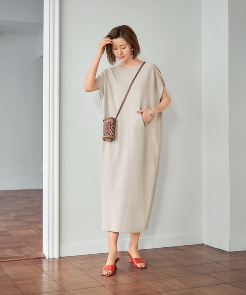 夏に快適なサマーニット素材で作られた、フロントのハの字型ポケットがポイントのワンピース。ゆったりとした身幅で着るとフレンチスリーブになり、体型カバーを叶えてくれるラクちんな一枚です。 エイみたいで可愛い♪とお客様や内外の人に好評のポケットデザインは、これがあるだけでウエスト位置を高く見せ、腹部の出っ張りをカバーして全体にメリハリを付けてくれる優れモノ。流行りに関わらずいつのときも可愛く、発売してから5年以上の人気が続くロングセラーデザインになっています。 【デザインや生地について】 ◆ストンと着れてゆったりとした、ストレスの無いラクちんワンピース。身幅よりも裾幅が狭いため、少しコクーンなシルエットに見えるタイミングもありますが、丸みはありません。 ◆涼感シリーズ独特な上品さや高級感は持ちつつ、スニーカーやスポサン、キャップなども似合うデザイン。キレイめにもカジュアルにも使えます。 ◆とくにどういった丈感で着るのが良いという設定は無く、身長に応じてミモレ丈になってもマキシ丈になっても、身長を問わずに可愛くご着用いただけます。 ◆着ると二の腕の上部が隠れる、フレンチスリーブ風ノースリーブ。シャツやサマーブルゾン、ジャケットやカーディガンなどは普通に羽織ることができます。 ◆生地の伸縮性は強く、背面裾にスリットがあるので脚さばきの良さをキープできます。大股歩きも自転車もOKとお客様にお喜びいただいております。 ◆鎖骨が見える程度に開いた、浅めのラウンドネック。肩周りの骨格によっては、ボートネック風に見えたりもする女性らしい印象のネック周りデザインです。 ◆端処理にリブを使用していないタイプのニットワンピースで、スッキリとした印象。カジュアル過ぎずにどことなく品の良さや女性らしさを感じるのはそのためです。 ◆汗ばむ肌でもサッパリとした肌触りで着れる、涼感タイプの夏用糸を使用。汗も染みにくく、チクチク感や毛羽立ちも少ないお素材です。 ◆生地に厚みは無いですがしっかりとしており、イイ感じのハリ感でボディの肉感をカバー。一枚でもキレイに着れますが、中にペチコート等を入れると歩行時などもさらに美しく、腹部やヒップの肉感カバー効果も高まるのでお薦めです。 ◆こちらのワンピースは目安として157cm以上の普通身長以上の方にお薦めしております。小柄な方でもマキシ丈のような長い丈感がお嫌いでなければ、デザイン的にはまったく問題ありません。 ◆着る方の年代や体型、系統を問わずに、長くお使いいただけるシンプルなデザイン。だけどいつでも・どこでも見つかる『ありきたり』な感じではないところが人気のヒミツです。 【丈伸びについての情報】 ◆ニットワンピースは着丈の概念が布帛のワンピースと異なります。表示されている着丈は平置き採寸時の寸法ですが、着用することで重力により着丈が伸び、着用してちょうど良い感じの長さになるよう設定しております。 ◆どのくらい伸びるのかという点については、その方の体型や動作で差が生じてきます。例えば肩の薄い方や胸部の厚みが薄い方、なで肩の方はそうでない方よりも基本的に長めの着用感になります。動作に関しては、座る際や運転の際に、ヒップ部分の伸びが生じないように座り方を意識をする方としない方で差が出たりもいたします。また、使用する洗剤や干し方、スチーマーのかけ方などでも差が出るようです。それらの要素が合わさり、ほぼ伸びない方と沢山伸びてしまう方と、様々なケースが生じます。 ◆同じ素材、同じ型のワンピースでも、染料によって伸びやすさは変わるため、カラーで差異が生じます。 ◆着用により少し伸びてきてしまっても、洗濯時の干す際に横方向に引っ張ることで、糸の詰まり方向が変わるため丈伸びが緩和されることも多々あります。重力に逆らうように、編み目の負荷方向を変えるようなイメージです。 ◆これらを書いてしまうことで大袈裟な感じになってご不安を助長するかもしれないのですが、ニット製品にはよくある基本的な通常特性(※)となりますので、ぜひ気構えずにニット素材ならではの可愛さをお楽しみいただければと思います。ニットワンピースの扱いに慣れますと、ほとんど丈を伸ばすことなく使い続けることも可能になります。 ※ニット製品の中でも伸びやすいものとそうでないものがありますが、そこに値段や質は関係がなく、単純に糸の種類と編み方とデザインで分かれます。 【お色について】 ◆ネイビー:通常の定番ブラックです。 ◆ソフトチャコール:チャコールを柔らかく発色させた、やや赤味を含んだお色。 ◆キナリベージュ:白よりは濃く、ライトベージュよりは薄く、クリーム色よりはもっとナチュラル感のあるお色。 ※商品コメントの内容はブランドプロデューサーによる説明文です。