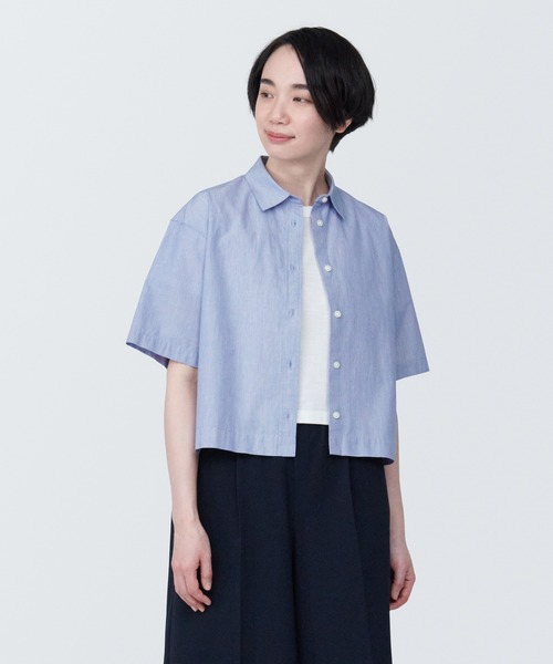 さらりとした肌あたりが特長の、涼感素材を使いました。綿はオーガニックコットンです。 【素材】 耐久性と吸水性、速乾性にすぐれた綿100%の涼感素材です。綿の糸を強く撚り、縦糸に太さの異なる糸を使用し、生地に細かな凹凸を作ることでさらっとした肌あたりです。 【デザイン】 ボックスシルエットの半袖シャツです。クロップド丈で、ボリュームのあるボトムスとも組み合わせやすく、ワイドパンツやAラインスカートとのコーディネートがおすすめです。二の腕が隠れる長めの袖丈です。 【仕様】 透け感:ややあり 伸縮性:なし フィット感:ゆったりめ 【おすすめポイント】 同じ素材の「涼感ブロードフレアスカート」とセットアップするのもおすすめです。 ●プリント部分はアイロンでこすらないでください。 ●アイロンはあて布を使用してください。 ●淡色製品には蛍光増白剤入り洗剤を使用しないでください。 ●濃色製品は使用中の摩擦や濡れた状態での接触により色移りする事があります。洗濯の際は他のものと分けて洗ってください。