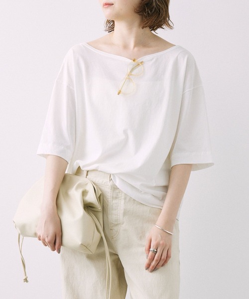 2024SUMMER COLLECTION ◆DETAILポイント◆ 大きく開いたネックラインがポイントのTシャツ。カジュアルなアイテムに、落ち感のある素材と後ろの開きのディテールで抜け感をプラスしました。インナーとしてはもちろん、一枚着でも様になるトップスです。 ◆FABRICポイント◆ 着心地のいいシャリ感とドライタッチが特徴。特殊な紡績をした毛羽の少ない糸を使用している為、毛玉が発生しにくい特徴があります。 【BABYLONE / バビロン】 "Be myself" 好きな色 好きなかたち 好きな着こなし 自分の好きは自分だけが知ってる 自分らしい自分を好きでいたい 時代のニュアンスを取り入れながらも まわりにとらわれない ブレないしなやかな女性たちへ 【気になる商品は「お気に入り」登録を】 ハートマークをクリックし、お好きなカラーを選んでお気に入りに登録すると 在庫残り僅かの通知、再入荷通知などの情報を受け取ることができます。 ※商品の取り扱い方法につきましては、タグ等に記載されている「取り扱い上の注意」「洗濯表示」をご確認ください。 ※屋外での撮影画像は、光の当たり具合で色味が違って見える場合があります。あらかじめご了承ください。なお商品の色味は、スタジオ撮影の画像をご参照ください。