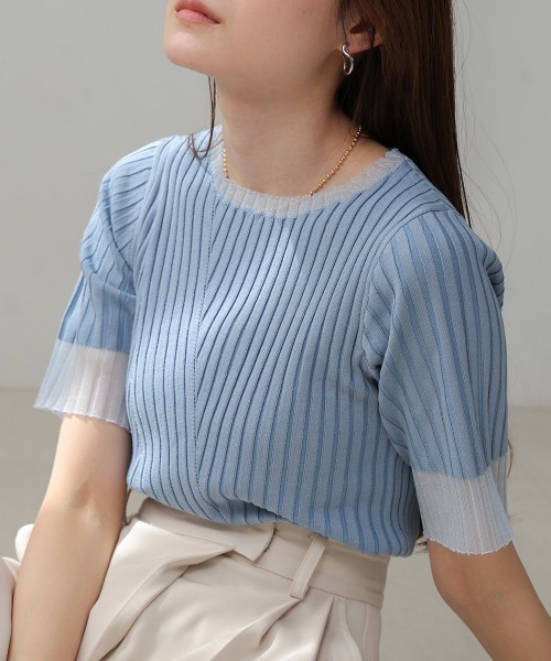 ●Bab●■POINT襟と袖のラメシアーが印象的なリブニットトップスです。ミニマルな見た目ながら体に沿いすぎないサイジングと、気になる二の腕をカバーする五分袖が上品さを誘います。インナーとしてレイヤードしてもごわつき感が無く、ランダムなリブ使いで1枚着でも着映えを叶えてくれる 春夏のワードローブに加えたい旬なアイテムです。■FABRICニット部分は太めのリブでランダムな模様がしっかりと映えるデザイン。細番手の編地でさらりとした肌触りです。シアー部分はシャリ感があります。■COORDINATEキャミワンピースのインナーにはもちろん、ジーンズやタイトスカートのトップスとして1枚着でお召し頂いても パッと華やかな印象のワンツーコーデが出来上がります。…………………透け感:襟、袖のシアー部分あり裏地:なし…………………※撮影環境により、多少実際のカラーと異なる場合がございます。また、携帯やスマートフォン、パソコンなどの画面上と実物では多少色が異なって見える場合がございます。ご了承下さいませ。※画像の商品はサンプルのため、実際の商品と若干仕様が異なる場合がございます。※濃色品は、過度な摩擦や濡れた状態での摩擦により、色落ち・色移りをする恐れがあります。※この商品は、素材の特性上、洗濯の際に多少の縮みが生じる恐れがあります。洗濯後は形を整えてから干してください。※その他お取り扱いに関しましては、商品に付属のアテンションタグをご覧ください。★商品のお気に入り登録再入荷やラスト1点のお知らせ、セール情報などお知らせを受け取ることができます!★ブランドのお気に入り登録新商品や再入荷などのお得な情報を受け取ることができますので、是非ご登録ください。★Bab公式Instagramアカウント【bab.showroom】で最新情報をチェック!