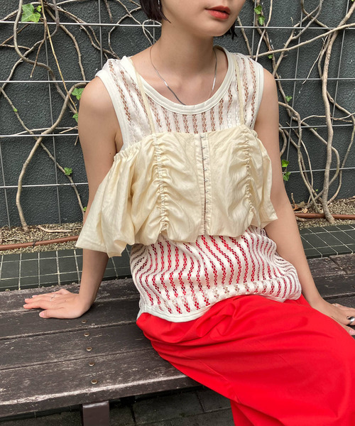 【様々なスタイリングが叶う、KBF的変化球ビスチェ】 フロントに施されたホックが目を惹くビスチェ。袖を通すとパフスリーブのブラウス、肩を落として着ていただくとオフショルダーに。また、袖を抜くとキャミソールビスチェにも変化します。その日の気分によって様々な着こなしを楽しめるアイテムです。 COORDINATE これからの季節は薄手のトップスの上から重ね、盛夏はタンクトップの上から合わせるだけでサマになります。マンネリ化したスタイリングにフレッシュさを与えてくれます。 【2024 Spring/Summer】【24SS】 ※この商品は、デザイン上モノフィラメント糸を使用しています。糸の特性上ザラザラした肌触りがあり、肌に触れますと赤くなる場合があります。特に肌が弱い方や汗をかきますと顕著になります。直接肌には着用せず、下に1枚着用することをお勧めいたします。 ※商品画像は、光の当たり具合やパソコンなどの閲覧環境により、実際の色味と異なって見える場合がございます。予めご了承ください。 ※商品の色味の目安は、商品単体の画像をご参照ください。 ▼お気に入り登録のおすすめ▼ お気に入り登録商品は、マイページにて現在の価格情報や在庫状況の確認が可能です。 お買い物リストの管理に是非ご利用下さい。 素材感 透け感 : なし 伸縮性 : なし 裏地 : あり 光沢 : ややあり ポケット : なし One