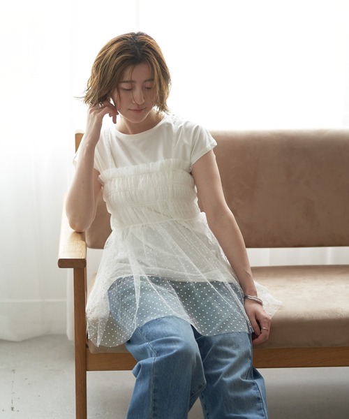 ドット柄チュールキャミソールと、着回し力の高いカットソーの2点セット。キャミソールは前後2WAYで着用可能です。胸下からふんわり広がるフィット&フレアなシルエットがフェミニンな印象を与えます。カットソーはヘルシーなフレンチスリーブデザイン。着心地の良い素材でデイリーユースもしやすいです。セットでもそれぞれ単品使いでも着用が楽しめるアイテムです。 透け感[有り]※ブラックTシャツは[無し] 裏地[無し] 伸縮性[やや有り] 光沢感[無し] 生地の厚さ[薄手] 付属品[有り]2セット【Tシャツ・キャミソール】 ポケット[無し] 【キャミソール】 身幅:[後ゴム仕様]32.5cm 着丈:58cm 裾幅:106cm 【Tシャツ】 身幅:47.5cm 着丈:60.5cm 肩幅:56cm 裾幅:50cm -------------------------------------------●YECCA VECCA●(イェッカ ヴェッカ)「大人のハッピーモードな着映え服」毎日を自分らしく、ハッピーに過ごすことにポジティブな女性のためのリアルクローズ。キーワードは「遊び心のある、女性らしいモード服」でも「コンフォート」。都会的で女性らしいムードを大切に着ていて心地よく、気持ちが上向きになるような遊び心のあるデザインウェアをラインナップ。自分自身がわくわく出来る洋服で日常を最大限に楽しむ大人の為のスタイルを提案していきます。▼商品のお気に入り登録がおすすめです ▼商品ページ内のハートマークをクリック。完売時の再入荷や、最後の1点の通知、コーディネート画像がアップされたとき、お得なお値下げの際の通知を受ける事ができます。【お知らせ】ページでも通知が確認できます。-------------------------------------------