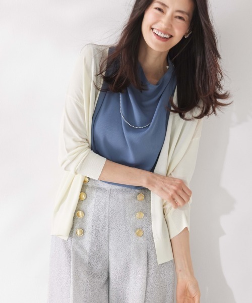 さっと気軽に羽織れるトッパータイプのカーディガン。ボタンなどのないトッパータイプのカーディガンはさっと気軽に羽織れ、さらに、すっきりとシャープな印象をプラス。ほんのりとひんやり感じるシャリ感と、UVカット加工が施された素材で、これからの季節には欠かせないアイテム。余計なディテールを一切省いたシンプルデザインなので、スタイリングを選ばず着られる優秀な一着です。■素材シャリっとした質感で、肌に触れるとほんのりとひんやりさを感じる素材。これからの季節に嬉しいUVカット加工。ご自宅で手洗い可能。【透け感】ややあり【生地の厚さ】やや薄手【伸縮性】あり※掲載画像は、屋内や屋外の光の加減やお客様のモニター環境などにより、実際の色味と異なって見える場合がございます。予めご了承ください。※製造工程の関係上、各採寸箇所実寸(平置き)より【約-3cm~+3cm】程度は誤差の許容範囲とさせて頂いております。