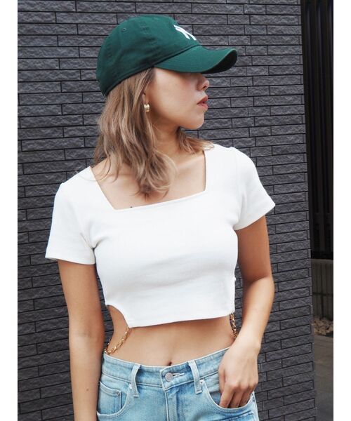 【クロップド丈】■商品ポイント・両サイドのチェーンがポイント・華奢見えチェーンでスタイルUP・シンプルなリブ素材・スクエアネックでデコルテきれい見え◎■商品について裾の両サイドにチェーンを付けたエッジを効かせたTシャツです。シンプルながらも程よく露出ができ、女性らしいデザインになっています。スクエアネックでデコルテが綺麗に見えます。どんなボトムスにも合わせやすいです。