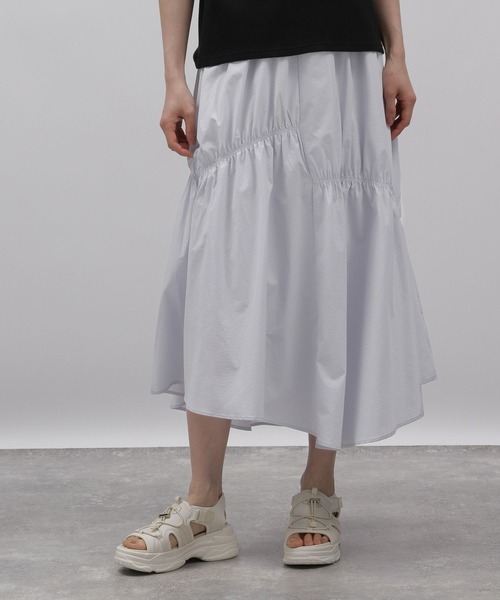 アシンメトリーデザインのスカート。ティアードシルエットで動きのあるデザインでも、もも周りにギャザーも施し腰回りはすっきりと見える1枚です。ウエストはゴム仕様で着脱が楽なのもポイント。【スタイリング】広がりのあるシルエットなのでコンパクトトップスと相性〇