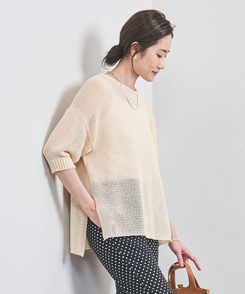 暑い時季にも着心地軽やか、清涼感漂うサマーニット ■デザイン 編地に表情のある5ゲージの度違い天竺編み地。 前後の着丈差やサイドスリットがこなれ感を演出。 後ろはヒップにかかる着丈で、スリムパンツ合わせも素敵に着こなせます。 ・OFF WHITEの襟ぐりと袖口はブラックの配色です。 ・その他6は、LIME色より淡く明るいライム色です。 ■素材 和紙を極細にスリットさせてポリエステルと撚糸した糸。 軽やかで清涼感があり、さらっとした肌離れの良い質感が特徴です。 ■コーディネート インナーにはキャミソールやタンクトップを合わせて軽やかに。 ボトムスはワイドパンツやスリムパンツ、スカートなどさまざまなデザインと好相性です。 抜け感のある首元や手元にはアクセサリーも品よく映えます。 ・同素材のニット(ロングスリーブ)のご用意もございます。対象品番:15132991812 ============================ 裏地:なし 透け感:あり 光沢感:なし ケア方法:手洗い可 ============================ 【注意事項】 ※商品を使用前に、タグ等に記載されている「取り扱い上の注意書き」、「洗濯表示」を必ずご確認ください。 ※商品画像は、光の当たり具合やパソコンなどの閲覧環境により、実際の色味と異なって見える場合がございます。あらかじめご了承ください。 ※画像の商品はサンプルです。 店舗へお問い合わせの際は、全国のUNITED ARROWS各店舗まで下記の品名/品番をお申し付けください。 品名:□UBC PAPER SSL 品番:15182991822