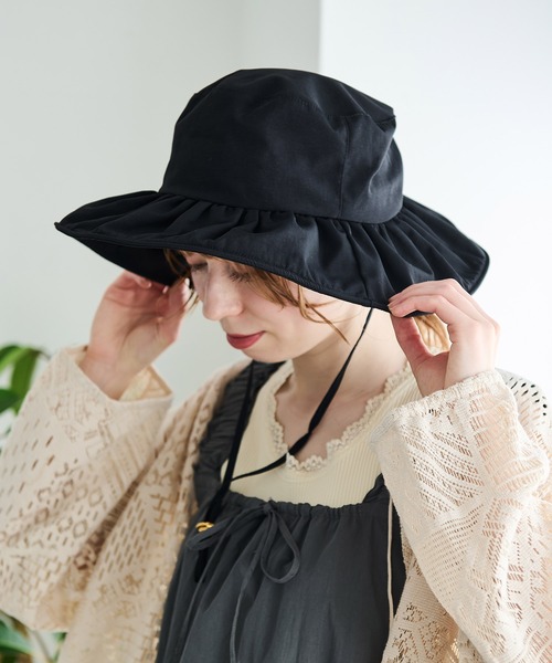 フリルのようなギャザーを施したツバがトレンドライクなハット。 UVカット加工付きでこれからの季節に活躍のアイテムです。 ツバが広いデザインなのでしっかりと日差しを避けながら小顔に見せてくれるのも嬉しいポイント。 あご紐はサイドのフックで取り外せるので、様々なスタイリングを楽しめます。 デイリー使いにはもちろん、ピクニックなどアクティビティの場面にもぴったりのアイテムです。 シンプルなデザインなのでスタイリングを選ばずにお使いいただけます。 ※ サンプル商品で撮影をしております。生産時の生地のロット違いによる色の差が生じる場合もございます。不良品ではございませんのでご了承くださいませ。 ご不安のある方、ご理解いただけない方に関しましては、大変心苦しい限りではございますがご購入をご遠慮いただけますようお願いいたします。