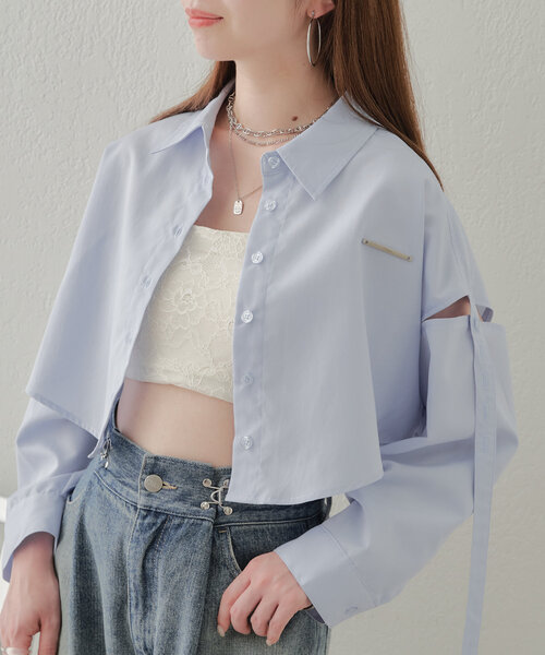 スタイルアップの叶う短丈シャツ▶商品ポイント・裾のラウンドデザインが今っぽい!・プレートが他と差をつけるワンポイントに。・肩開きの部分はボタンで開き具合の調節が可能です▶スタイリングポイント・ボトムを選ばず着回しが効くので、1枚は持っておきたい短丈シャツ・ボタンを開けてインナーを見せたヘルシーコーデもおすすめです。・よりトレンドライクに着るならインナーをガーターベルトデザインにして下から覗かせても◎▷▶【ガーターデザインタンク】……………………透け感:白のみややあり厚さ:ふつう伸縮性:なし裏地:なし……………………▶洗濯表示洗濯:手洗い可タンブル乾燥:不可アイロン:110度まで※取り扱い注意事項(詳しいお手入れ方法は商品タグをご参照ください)・色移りすることがありますので、他の物と分けて洗濯し素早く干してください。・お洗濯や着用時の引っ掛けには十分にご注意ください。・濃色品は汗や雨等で濡れた時や摩擦により、他の衣類や持ち物等(特に白)に色移りする可能性がございますので、十分ご注意ください。--------------------------------------------▼お気に入り登録のおすすめ▼ハートをクリックしてお気に入りに登録すると完売カラーの再入荷や残り1点の通知、セールの通知を受けとることができます。▼ブランドのお気に入り登録▼新商品や再入荷、セール通知やショップのおすすめトピックスなど、いち早くブランドの情報を受け取ることができます。▼メルマガ登録▼Chicoお得な情報やニュースを一足先にお届けします。--------------------------------------------※商品について・サイト上のカラー名と、お届け商品に記載されているカラー名が異なる場合がございます。・商品の色味は、撮影場所や光のあたり具合などにより色味が違って見える場合がございます 。また、お客様のお使いのPCのモニター環境などにより色味が違って見える場合がございます。予めご了承の上ご注文下さい。・セールは予告なく終了させていただく場合もございます。※商品ページでは、遅延などの影響も考え、お届け予定時期を少し先に設定させていただいております。予約商品は商品ページに記載しているお届け予定時期よりも早いお届け予定になる場合がございますので、予めご了承ください。※返品・キャンセルについて・着用、洗濯後の返品、交換は致しかねます。・商品到着後、着用前に商品を確認して頂きますようお願い致します。※画像の商品はサンプルです。実際の商品と仕様、加工、サイズ、素材が若干異なる場合がございます。※ご注文いただいた予約商品のお届け時期の確認は、注文履歴ページより行えます。