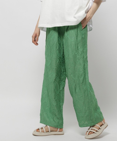 立体感が目を引く、上品ジャカードパンツ ■素材特性 シワができにくいポリエステルとレーヨンを使用しています。 裏地はコットン100%でやさしい肌触りです。 ■デザイン 表情豊かなジャカード織が上品なストレートパンツ。 立体感のある生地感でコーディネイトを華やかにしてくます◎ 今年らしいワイドストレートなシルエットはどんなトップスにも合わせやすいです。 タッセルロープベルトはトップスインした際にワンポイントにも♪ 模様が引き立つアイボリーとシックに装えるブラック、目を引くグリーンの3色展開。 イージーウエストでリラックス感がある履き心地なのも嬉しいポイントです◎ ■おすすめスタイリング レースやメッシュ素材とのレイヤードで涼し気に◎ プリントTシャツと合わせてカジュアルダウンなスタイリングもおすすめです。
