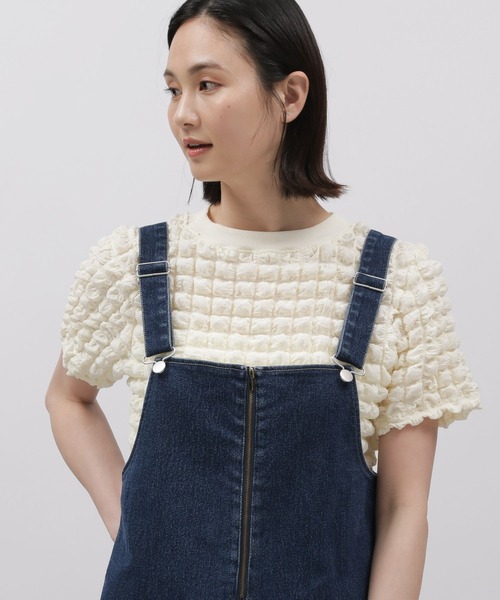 ポコポコとした表面感が特徴的なTシャツ。 伸縮性のある素材感で程よくコンパクトなシルエットなのですっきりとした印象の1枚です。 襟元の配色デザインがアクセントになり〇 【スタイリング】 短めの丈なのでボリュームのあるボトムと相性の良いアイテムです。 サロペットやキャミワンピースのインナーとしてもおすすめです。