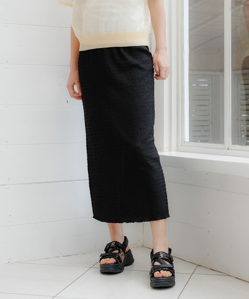 表面感のある生地のナロースカート。伸縮性のある素材でウエストにはゴムを使用しラフな着心地の1枚です。長めの着丈でも後ろにスリットをデザインし足さばきが良いのもポイント。【スタイリング】コンパクトなトップスとの相性〇ウエストがフラットデザインなのでトップスインスタイルもしやすいデザインです。