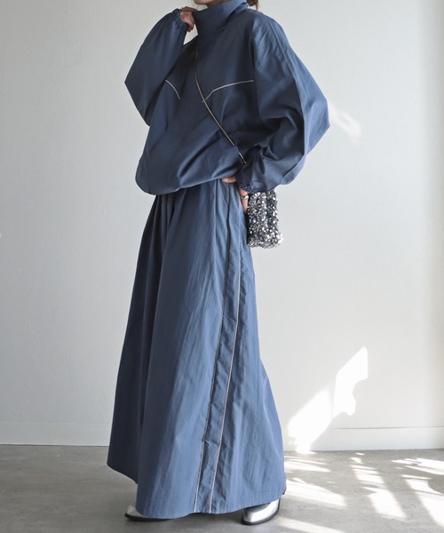 ゴープコアにかかせないナイロン素材の使い勝手の良い万能ラインスカート-detail-配色になったウエストのドローコードとサイドパイピングが他と差のつく見え方になります。ウエスト部分に複数のタックとフレアシルエットになったAラインのボリュームあるサイジングにより、動きによってスカートの見え方が変化するのもこだわりポイントです。-fabric-マットな風合いのナイロンワッシャー素材。高密度に織られているため耐久性に優れており、軽量でありながら頑丈さも兼ね揃えておりアウトドアにも最適です。-styling-セットアップで着用可能なこちらのパイピングナイロントラックジャケット(181971C)との組み合わせはもちろん、シンプルにシャツやカットソーとの組み合わせでも主役になるアイテム。トラックジャケットやサイドライントップスなどのコーデにも使いやすい素材感です。ショート丈のトップスやアウターとのコーデもおすすめです。レディースモデル身長:162cm モデル着用サイズM