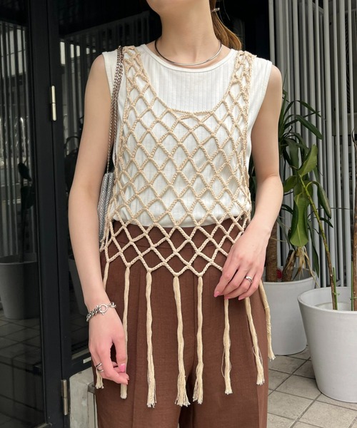 春夏コーデをアップデート♡ プラスワンするだけでトレンドライクに! ■デザイン トレンドのマクラメ編みのベストが登場。 いつものスタイリングの上から着用するだけで、トレンドっぽコーデに♩ 裾部分の長めのフリンジが、コーデのアクセントになります! やや伸縮性があり、着脱も簡単で楽ちんなのも嬉しいポイント◎ 簡単にシーズンムードを高められる、おしゃれ見えアイテムです♡ ■スタイリング ロゴTEEやシアートップスの上から着るだけで、簡単レイヤードコーデの完成! 夏は、タンクトップの上から合わせたヘルシーコーデも◎ 合わせるアイテム次第で、ロングシーズン着用できます! ■お手入れ方法 洗濯:裏返してから洗濯ネットを使用し、洗濯機の手洗いモード可(押し洗い推奨/単独洗い) タンブル乾燥:不可 アイロン:あて布を使用し、110℃まで可 ・・・・・・・・・・・・・・・・・・・・・・ 透け感:あり 裏地:なし 伸縮性:ややあり 光沢感:なし 生地の厚さ:普通 ・・・・・・・・・・・・・・・・・・・・・・ 気になった商品はお気に入り登録がオススメです! 入荷情報や、クーポン情報が通知されるようになります。 ※画像の商品はサンプルです。 実際の商品と仕様、加工、サイズ、素材が若干異なる場合がございます。