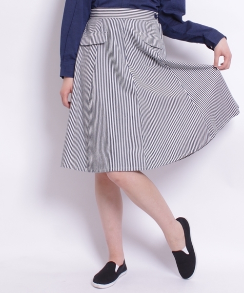 爽やかなヒッコリーデザインが春夏らしいデザインスカートが入荷。 フロントにはフェイクのフラップを取り付けアクセントをプラス。 後ろ身のウエスト部分がゴム仕様になっておりストレスなく着用して頂く事が可能です。 トップスにはシャツやTシャツなど様々なアイテムとの相性も抜群です。