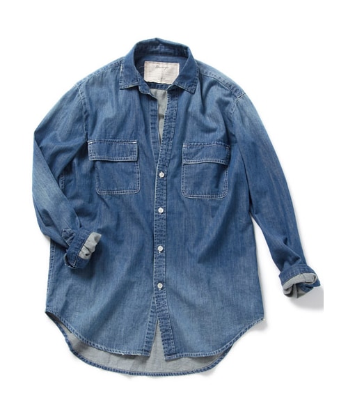 薄手のデニム素材に洗いをかけて、柔らかい風合いに仕上げたデニムシャツ。ヴィンテージライクなスレ感や加工感が絶妙な1枚です。大きなフラップポケットがラフなアクセントもプラス。ゆったりとしたシルエットに仕上げているので、ライトアウターとしてTシャツの上にさらっと羽織るのもオススメ。※サンプル撮影のため画像と若干ディテールが異なる場合がございます、ご了承下さい。