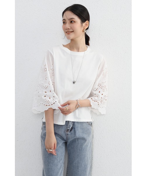 〈おすすめポイント〉 両袖に透け感のあるレースデザインがポイントのカットソー。 どんなスタイルにも合わせやすい万能アイテム! パンツやフレアスカート、サロペットのインに◎ 二の腕から肘まで隠せてきれい見えが叶う♪ ■サイズ(cm) ・F:総丈60 バスト98 袖丈41 裾幅42 ■素材:コットン95% スパンデックス5% ■生産国:中国 ■色:ブラック ホワイト ■透け感:なし ■生地の厚さ:普通 ■伸縮性:ややあり ■ファスナー:なし ■裏地:なし ■胸パッド:なし ※お使いの環境などにより実物と色が違って見えることがございます。 ※実際の商品と細部が異なる場合があります。 ※製造過程において染色剤や接着剤の匂いが残っている場合がございますが品質上の問題ではない為、これらの理由では不良品としての返品・交換をお受けできません。 ◆関連ワード カットソー トップス 半袖 レディース カジュアル Tシャツ レース袖 ゆったり ゆる 綿 レース 異素材 体型カバー 大きいサイズ きれいめ 可愛い 春 夏 シンプル ナチュラル 大人可愛い 二の腕カバー 透け感 五分袖 無地 レースデザイン レース リラックス 部屋着 着心地いい 肌触りいい シンプル 通気性 柔らか カジュアル風 着回し 体型カバー お呼ばれ 女子会 旅行 お食事会 デート きれいめカジュアル ゆったり 体型カバー 20代 30代 40代 50代 ゆるっと ブラック 黒 ホワイト 白 F フリーサイズ rt3627