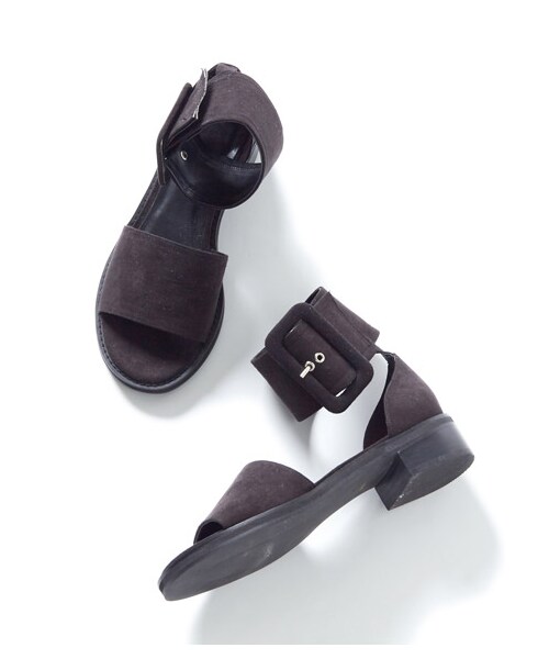 インパクトのある大きなアンクルベルトが特徴的なローヒールサンダル。シンプルなシルエットが足元をすっきりとした印象にしてくれるデザイン。ベルトを太くしたことで、足首を華奢に見せてくれる効果も。マットなスエード仕立ても大人カジュアルに履きこなせるポイントです。※サンプル撮影のため画像と若干ディテールが異なる場合がございます、ご了承下さい。