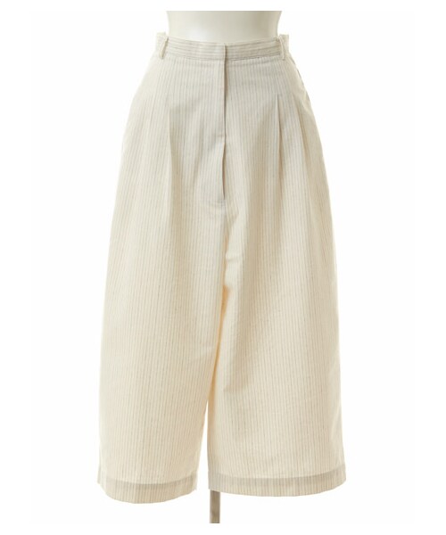 2トーンのカラーストライプが入った、コットンリネン素材で仕上げたガウチョパンツ。ウエストからヒップはすっきりとしたシルエットに仕上げ、ヒップ下から裾にかけてワイドに広がるラインが今年らしい1枚。ハイウエストデザインと裾広がりのゆったりとしたシルエットで、スタイルアップして見せてくれます。足首がキレイに見えるクロップド丈で、女性らしい抜け感のあるスタイルが完成します。※サンプル撮影のため画像と若干ディテールが異なる場合がございます、ご了承下さい。
