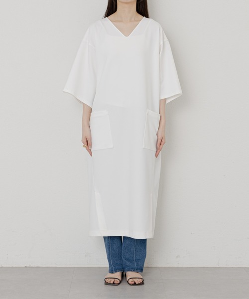 【2024SS】 ジョーゼット素材のさらっと着られるワンピース。 シボ感があり、収縮性がある柔らかい素材です。 フロントには大きなポケットを施し、シンプルなシルエットの中にワンポイントが。 コクーンシルエットとVネックのデザインがすっきり見えしてくれます。 柔らかい素材で、サイドスリットも入っているので、動きやすいアイテムです。 【コーディネート例】 ▶デニムパンツと合わせてカジュアルスタイルに ▶ショートパンツと合わせて1枚でワンピースとして <素材感> 透け感:あり 裏地:なし 生地の厚さ:やや厚い 光沢:なし ポケット:あり お取扱いについて ・洗濯:液温は40°Cを限度とし、手洗いができる ・漂白:塩素系及び酸素系漂白剤の使用禁止 ・乾燥:タンブル乾燥禁止、日陰のつり干しがよい ・アイロン:底面温度110°Cを限度としてスチームなしで アイロン仕上げができる ・クリーニング:石油系浴剤による弱いドライクリーニングができる、非常に弱い操作によるウエットクリーニングができる