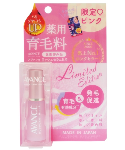 ZOZOCOSME AWARDS 2024 ベーシック部門 カテゴリー大賞 スキンケア ハリ・ツヤ・コシをUPして、ボリュームアップ&徹底ケア! 「アヴァンセ ラッシュセラムEX」は、毛根細胞を活性化し、発毛促進・育毛・抜毛・薄毛に効果的なロングセラーの薬用育毛料。 陽射しが暖かく和らいでくる時期にぴったりの、落ち着いたトーンで仕上げた限定デザインのピンクボトルです。 有効成分(パントテン酸誘導体、感光素)が毛根の血行を促進ながら細胞を活性化し、抜け毛を予防します。 有効成分(感光素301号、パントテン酸誘導体)と保湿成分(ニンジンエキス、キチンリキッド)の相乗効果で毛母細胞を活性化する医薬部外品ならではの確かな機能は、2000年10月の発売以来、まったく衰えない販売実績に裏づけられています。 無香料・無着色・オイルフリー処方です。 ■春はまつ毛に厳しい季節? お肌と同様、乾燥はまつ毛にとっても大敵です。 秋冬の乾燥で蓄積したダメージはまつ毛のキューティクルを開かせて、水分が失われやすくなってしまいます。 また、春を迎えると紫外線によるダメージが増大。「花冷え」といわれる寒暖差の影響や生活環境の変化に伴うストレス、スギ花粉の付着によるかゆみで目をこすってしまうなど、さまざまな要因が容赦なく襲いかかってくる厳しい季節でもあるのです。 ■「アヴァンセ」の歴史 1997年の発売以来、今や美しい目もとを演出するための必須アイテムとなったアイゾーン専用コスメブランド「アヴァンセ」。 マストアイテム「ラッシュセラム」シリーズのルーツといえるのが、東京・六本木の老舗化粧品メーカー・ハリウッド化粧品から昭和8年に発売された超ロングセラー養毛料「メイウシヤマ カーレン」です。 発売元であるアヴァンセ株式会社は、もともとサロン向けに販売されていたハリウッド化粧品だけではカバーできない市場をターゲットとして設立されました。 発売当初は2アイテムのみの構成でしたが、ハリウッド化粧品を母とする「アヴァンセ」ブランドの高品質が認知されたことによる人気の高まりとともにラインナップを拡充し、魅力的なアイゾーンを演出するために必要な全てが揃うトータルアイメイクブランドに成長。 現在のポジションを確立するきっかけとなった記念碑的なアイテムが、医薬部外品として開発された「ラッシュセラムEX」です。 【使用方法】 発毛促進、育毛、抜毛、薄毛に効果がある薬用育毛料です。抜毛・薄毛の気になる所にご使用ください。 ●他の物質が混入すると、液が白濁することがありますのでご注意ください。白濁しても効果は変わりません。 ●いったん手に取った中身は変質の原因になりますので、容器に戻さないでください。 ●ブラシに他の物質が付着したり、汚れたりした場合は、ブラシを洗浄し水分をふき取ってから容器に戻してください。 ●品質を守るために、容器の中へ水等を加えないでください。 ●本品は、薬用育毛料ですので、まつ毛美容液ではありません。 【使用上の注意】 ●お肌に異常が生じていないか、よく注意してご使用ください。 ●お肌に合わない時は、ご使用をおやめください。 ●傷やはれもの、しっしん等の症状がある部位には、お使いにならないでください。ご使用中やご使用後、刺激またはアレルギーによる赤み、かゆみ、刺激、色抜け(白斑等)や黒ずみ等の異常が現れた場合や、使用したお肌に直射日光が当たって異常が現れた場合は、ご使用を中止し、医師にご相談ください。そのままご使用を続けますと、症状を悪化させることがあります。 ●目に入らないよう気をつけてください。目に入った時は、すぐ水かぬるま湯で洗い流してください。目に異物感がある場合は、眼科医等にご相談ください。また、粘膜を強くこすりすぎないようにご注意ください。 【取扱い上の注意】 ●ご使用後は、必ずキャップをきちんと閉めてください。 ●一度ご使用の後、長期間放置してからの再使用はおやめください。 ●極端に高温または低温となる場所、湿度の高い所や低い所、直射日光のあたる場所には保管しないでください。 ●乳幼児の手の届かない所に保管してください。