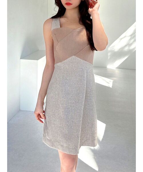 フロントのクロスがアクセントになったミニワンピース ▽デザイン▽ ウエストはシャーリング仕様で心地よく、 程良いタイトシルエットにすることで女性らしさを演出。 スカート部分はサマーツイードをあしらい、上品な印象に仕上げました。 1枚でスタイルアップできるデザインにこだわった1枚です。 ▽カラー▽ 黒・ベージュの2色展開。 ▽スタイリング▽ 1枚で女性らしさUPの夏ワンピース。 ノースリーブなので羽織りも合わせやすく、ロングシーズン着用可能。 デイリー使いはもちろん、パーティーシーンなどにもオススメです。 ※着用画像はフラッシュの加減で実際の製品と色味等が異なる場合がございますので、生地のズームアップ画像をご確認ください。 ※ご利用の端末画面の設定により実際の商品と色味が異なる場合がございます。 【商品特徴】 透け感:なし 伸縮性:なし 生地の厚さ:普通 サイズ感:細身 裏地:あり ポケット:なし ファスナー:あり(後)
