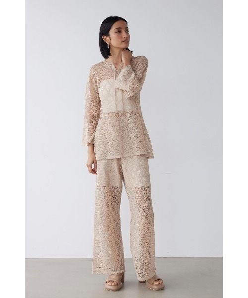 繊細な透かし柄デザインが目を惹く、ロングパンツ。品よく素肌の透け感を楽しめ、シーズンムード高まる1本です。ストレートシルエットになっており、脚のラインを美しく魅せてくれます。ハーフ丈の裏地やウエストゴム仕様で、ストレスフリーな穿き心地。Tシャツと合わせてカジュアルダウンしたスタイリングや、同素材を使用したOpen Work Knit Topとセットアップでの着用もおすすめです。※モデル着用画像はイメージのため、実際の商品のお色と異なって見える場合がございます。商品の詳細画像が実際の商品により近いお色となります。※ 製品タグに注意事項の記載がございますので、お読みいただき、正しくお取り扱いください。※サイズは平置き寸法です。