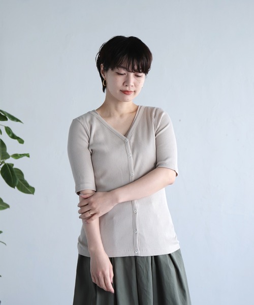 [ OWLEYE STANDARD ITEM ]***女性らしい着こなしに、着心地の良いリブカーディガン***・糸から制作し編み立てた、こだわりのオリジナルリブ素材を使用・身体のラインを拾いすぎないほど良い厚みの生地に絶妙な美シルエット・気になる二の腕をカバーしてくれる五分袖<素材>糸から制作し編み立てた、こだわりのオリジナルリブ素材は、繊細で滑らかな肌当たりが特徴。細番手の糸を丁寧に編み立てることで、伸縮性に優れ動きやすく、毛羽の少ない上品な印象に仕上げています。綿100%の素材。凹凸が少なくフラットな状態で着られインナーとしても合わせやすい、通年着られる素材です。<デザイン>上品な開きのVネックラインと、体に沿いながらもラインを拾いすぎず、心地良いフィット感で女性らしさを演出するショートスリーブカーディガン。首回りから前立てにかけて施したフライスはコントラストを生み程よいカジュアル感が魅力です。脇に接ぎ目がなく、後身頃に""かがり縫い""を施し、特徴的なデザインに。リブシリーズのアンサンブルとして着合わせも可能です。◇着用レビュー155cm / サイズM胸元は開きすぎず、すっきりときれいに見え上品なイメージに。背中に入った縦のラインが背中の丸みを目立たなくしてくれます。[OWLEYE by domingo / アウルアイ バイ ドミンゴ]「ベストデザイン、ベストプライス」をテーマに、心地よく利便性が高いもの、やさしい価格で買えるもの、日常を豊かにするものを展開していきます。一見ほかとあまり変わらないけれど、着てみると気持ちよくて扱いやすい。日常を快適に変えながら、⻑く付き合える工夫があったり、多様なシーンにも対応できる。 美しさだけでなく生活の中でふと感じる。心地よさを感じるウエアを提案します。model:H160 着用サイズ:Lお問い合わせ品番 : 79-0019N / 79-019N