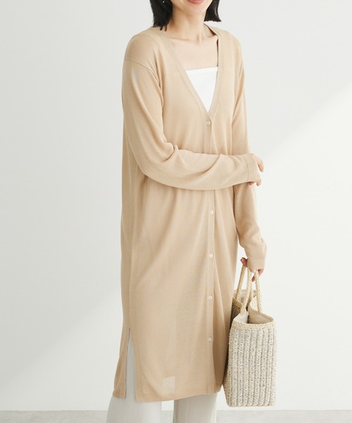 接触冷感アイテム 女性らしくさわやかなロング丈カーディガン。UVカット加工を施しており、日差しが強い季節の日でも安心してコーデを楽しむことができます。Iラインシルエットでスタイルアップを演出◎デニムと合わせることでまとまりがでて、大人かっこいい印象を表現することができます。 透け感[やや有り] 裏地[無し] 伸縮性[やや有り] 光沢感[無し] 生地の厚さ[薄手] 付属品[無し] ポケット[無し]●製品寸法:F:バスト50.0cm 着丈100cm 袖丈53.5cm 肩幅46.0cm 裾幅45.0cm備考: