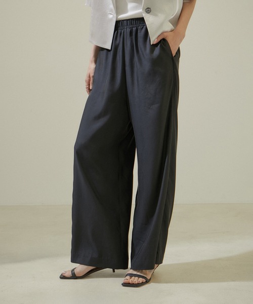 上品なツヤのあるシルキーな素材感が落ち着いた印象に映る、大人の夏のリラックスイージーパンツ■デザイン/シルエット 歩くたびに揺れるような落ち感が美しい、ワイドシルエットパンツです。 シンプルながらも光沢感のある素材で上品な印象に仕上げました。 程よいゆとり感がありながら落ち感のある素材なので腰回りはスッキリとした印象で着用頂けます。 ウエストはオールゴム仕様でリラクシーな履き心地。 内側の紐を絞れば、ウエストサイズも調整可能なので、幅広い体型の方に対応可能です。 イージーなデザインながらもサイドには側章風のデザインを効かせてきれいめなスタイルにも対応できるようなデザインに。 シックなブラックと落ち着きのあるベージュの2色展開です。 ■素材 シルキーな細番手のキュプラの糸にリサイクルポリエステルを組み合わせたエコな素材を使用。 程よく艶があり、ポリエステルを組み合わせることによりキュプラ100%に比べてシワになりにくいのも特徴です。 弱めのフィブリル加工を施し、ナチュラルなヴィンテージ感を出しています。 裏地なしでも透けが気にならないので暑い時期もサラッと着て頂けます。 ご自宅でお洗濯可能/マシンウォッシャブルなのも嬉しいポイント。 ■コーディネート Tシャツやタンクトップなどカジュアルなアイテムに程よく上品さをプラスできる夏に欠かせない1枚です。 ジャケットやシャツと合わせた大人の夏のリラックススタイルもオススメ。 ワンピースやチュニック丈のトップスとあわせてレイヤードを楽しむのも◎ ■モデル身長:172cm 着用サイズ:M(ロングヘアモデル) ■モデル身長:166cm 着用サイズ:F(ショートヘアモデル) ----------------------------- 裏地:なし 光沢感:ややあり 透け感:なし ウエスト:ゴム ポケット:あり 伸縮性:なし 生地の厚さ:やや薄手 -----------------------------
