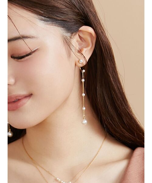 ストーンとパールのロングピアス揺れ感が可愛く、動くたびにキラキラとした印象に。顔周りを華やかに見せてくれ、デイリー使いはもちろん特別なシーンにもオススメです◎