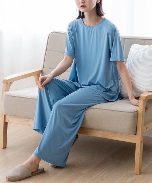 【デザイン】フローズンスムースルームウェア 上下セット 触れた瞬間ひんやり感じる「接触冷感」のルームウェア上下セット。 汗ばむ夏でも爽やかで涼しく、快適におうち時間を過ごせます。 ずっと触れていたい、とろみがある滑らかで優しい肌触り。 ゆったりとしたシルエットで着用もらくちんなので、ルームウェアに最適です。 トップスは前後差デザインになっており、ヒップがすっぽり隠れるのが嬉しいポイント。 ボトムスのウエストはゴム仕様になっており、紐でサイズ調節が可能です。 伸縮性のある生地なので、ストレスフリーでリラックスした着用感。 上下セットで着用するのはもちろん、単品で着用すればヨガやフィットネスでも大活躍。 さらにUVカット素材で、着るだけでおうちの中でも紫外線対策◎ 【サイズ等】 トップス ●総丈:約68cm ●身幅:約51cm ●肩幅:約40cm ●裄丈:約45cm ●袖丈:約24cm ●袖幅:約17cm ●重量:約150g ボトムス ●総丈:約92cm ●股上:約32cm ●股下:約60cm ●ウエスト:約64cm(調節可能) ●ヒップ:約100cm ●わたり幅:約28cm ●裾幅:約28cm ●重量:約240g ------------------------- ●素材:ナイロン92%、ポリウレタン8% ●裏地:なし ●伸縮性:あり ●生産国:中国 ●ポケット:あり ●その他付属品:なし ●透け感:光にかざすと手の形が見える程度 ------------------------- 【お取扱い上のご注意】 ・洗濯の際には、漂白剤や蛍光剤の入った洗剤を使用しないで下さい。 ・色物は、他の衣類と分けてお洗い下さい。 ・長い時間濡れたままの状態で放置したり、 洗濯の際、洗剤液や水に長時間つけ置きをすると、 色落ちするおそれがあります。 洗濯後は形を整えて直ぐに干して下さい。 ・タンブラー (回転式乾燥機) の使用はお避け下さい。 ・色・柄もの製品は、 濡れた状態でアイロンを 使用しますと、色落ちの原因となります。 アイロンがけは、生地が乾いた状態で行って下さい。 濃色の場合は濡れた状態や強い摩擦により合成皮革や他のものに色移りする恐れがありますので、 お取扱いには十分ご注意下さい。 生成りや淡い色のものは無蛍光洗剤を使用して下さい。 濃色については白い物と一緒に洗わずに洗濯後は積み重ねなど 放置することなくすぐに干して 下さい。 洗濯時はネットを使用して下さい。 濡れたまま放置しますと、白い物に色移りすることがあります。 アイロンは当て布を使用して下さい。 素材感をよりいかすため天然素材、 合成素材にかかわらず多少の色落ちの心配がございますので 摩耗及び雨天のご使用や白系統の衣服を着用の際には充分ご注意ください。 ※撮影環境により実際のカラーとやや異なる場合がございます。 画像をご参照の上、ご了承頂けますようお願い致します。 ◆商品のお気に入り登録◆ 完売カラーの再入荷通知や、ラスト1点の通知、 セールの通知も受け取ることができますので、是非ご登録ください。 ◆ブランドのお気に入り登録◆ 新商品や再入荷などの情報を受け取ることができますので、是非ご登録ください。