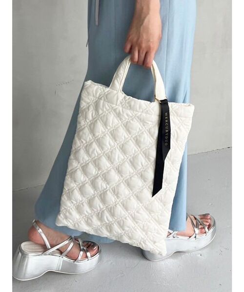普段使いしやすいサイズ感と、キルティングの柔らかい素材でPCも収納できるトートバッグ。パールのようなメタリックカラーとベーシックカラーで、フェミニンなスタイリングにも、モードなスタイリングにも◎肩掛けと手持ちの2WAY使用可能です。MERCURYDUOのロゴがプリントされた配色のグログランリボンは、取り外し自由です。※画像はすべてサンプルです。※サンプルから長い方の持ち手の長さ3cm短くなります。※サンプルから短い方の持ち手、3cm長くなります。