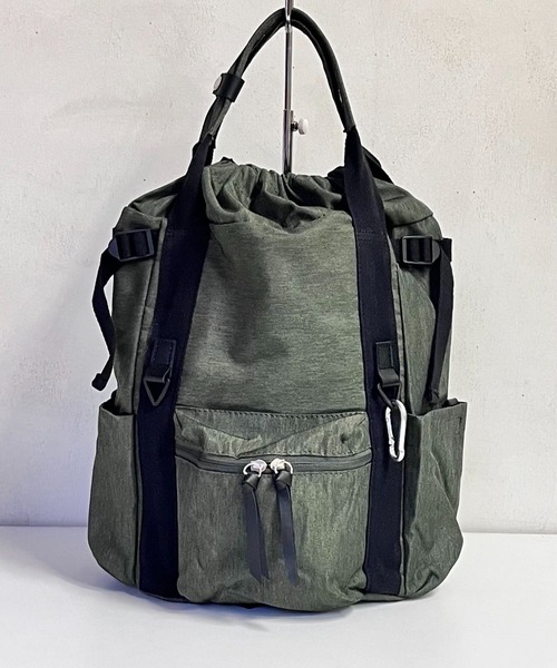 本体地は、コットンライクなムラ感のあるポリエステル素材。 付属に牛革を使用し高級感をアップさせました。 マチ幅調節ベルト、本体中へのアクセス可能なファスナー、手持ちハンドル など機能的なパーツが付いた巾着タイプのリュックです。 ★デザインポイントの三角カンにはキーホルダーやカラビナを装着可能。 ・内ポケット3 ・外ポケット4