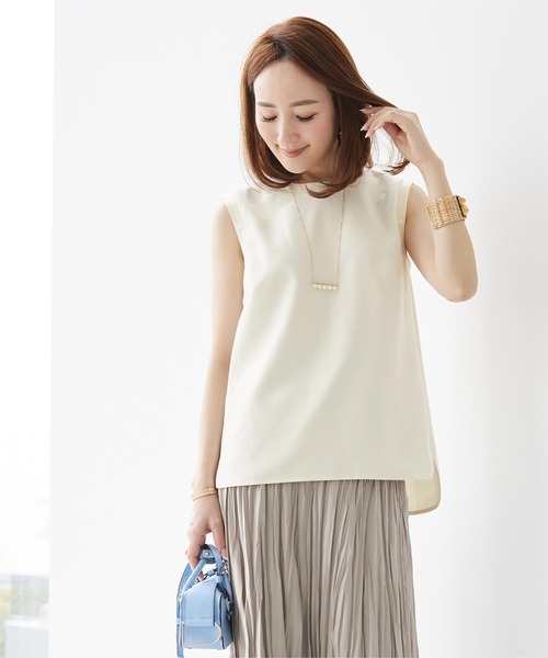 サテン切替がアクセントのノースリーブトップス。◆DETAIL異素材使いで襟ぐり、アームホール部分にサテンを使用しておりサテンの光沢が上品な1枚です。クルーネックで、アームホールもできる限りサイズを詰めて脇部分が気にならない開きに仕上げました。着丈は前後差がついているので、裾アウトではもちろん前裾のみタックインしてラフに着こなせます。◆FABRIC上品な光沢のサテンとさらっとした柔らかな素材。◆COORDINATE同素材のボトム(BDXN1876)に合わせれるのでセットアップで着用可能ジャケットやジレの中にインナーとして着用頂くのもオススメです。※生産時期により、セットアップの提案をさせて頂いております商品と色差が生じる場合がございます。予めご了承ください。※当商品は機械による生産の過程上、どうしても"生地を織る際の糸の継ぎ目"や多少の"ほつれ"、他繊維の"混紡"、また、形やサイズや柄に多少の"誤差"が生じる場合がございます。※サイズは、実寸サイズを測っているため多少誤差がでる場合があります。製造工程の関係上、各採寸箇所実寸(平置き)より【約-3cm~+3cm】程度は誤差の許容範囲とさせて頂いておりますので、予めご了承くださいませ。※メーカーより密封状態で入庫し、検品時に再度袋詰めを行っておりますが、素材により染料等の臭いが強い場合がございます。※発送上の状態によって商品がシワになる場合がございます。※商品により色落ち・色移りがある場合がございますので、品質表示をご確認の上、お取り扱いにご注意くださいませ。【伸縮性】あり【透け感】多少あり