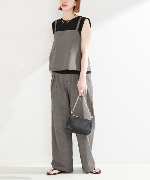 マルチにスタイリングが楽しめる着回しセットアイテム。 麻混生地を使用したキャミソールとパンツ、リブ素材のカットソー地のタンクトップの3点がセットになったお得なアイテムです。 細めタックが3本入ったパンツは単品でも着回しができ、キャミソールをパンツにインして着るとサロペットの様にも見えマルチなスタイリングが可能になっています。 キャミソールとパンツは洗濯機洗い(弱)可能、カットソーは手洗い可能でご自宅でのイージーケアができるのも嬉しいポイントです! ※カラーにより素材が異なります。 <布帛> ・カーキ(036)、ネイビー(040)カラー 本体:ポリエステル46%、麻36%、レーヨン19% ・ブラック A(002)カラー 本体:ポリエステル40%、レーヨン29%、麻19%、綿8%、再生繊維(セルロース)4% <カットソー> 本体:ポリエステル61%、レーヨン32%、ポリウレタン7% ********************** 透け感:やや(ネイビー:白トップスのみ) 裏地:なし 伸縮性:ややあり(カットソーのみ) 光沢感:なし 生地の厚さ:普通 ********************** 【スタッフ着用コメント】 《スタッフ staff.k》 身長:162cm/普段サイズ:S~M/着用サイズ:フリー サイズ感:カットソーはぴったりめ、パンツはフリーサイズですがちょうどよく、後ろゴム仕様で伸縮性があります。 素材感:リブで伸縮性がある薄手カットソー、麻混のさらっとした肌触りの布帛素材です。 着心地:ややジャストなサイズで生地は柔らかく着心地ラクです。 ※あくまで個人の感想です。 ********************** ※取り扱いについては、商品についている品質表示でご確認ください。 ※布帛生地について(キャミソール・パンツ) ・水分で収縮したり、シワになりやすく、摩擦や洗濯により白化や毛羽立ちする性質があります。水ジミが出来やすいので雨や水濡れにご注意ください。 ・麻は素材の特性上、シワになりやすく、表面に織フシ(ネップ)があります。摩擦や洗濯により白化、毛羽立ち、部分的な脱色が起こることがあります。 ・素材の特性上、洗濯や着用中の摩擦により生地表面が毛羽立ち、毛玉(ピリング)が生じます。 連日の着用は避け、毛玉が生じた場合は引っ張らず、小バサミで丁寧にカットしてください。 ・形を整えて干してください。洗濯により収縮やねじれ。型崩れすることがあります。 ・着用中の摩擦や、汗、水濡れにご注意ください。濡れたままの状態で擦れると、色移りすることがあります。 ※カットソー生地について ・濃色品は色落ちすることがありますので、単独で洗ってください。 ・形を整えて干してください。洗濯により収縮やねじれ。型崩れすることがあります。 ※カットソー:ブラック A(002)、ネイビー(040)カラーについて ・着用中の摩擦や、汗、水濡れにご注意ください。濡れたままの状態で擦れると、色移りすることがあります。 ※こちらの商品は、B.C STOCKでの取り扱いになります。 直接店舗へお問い合わせの際はB.C STOCK店舗へお願い致します。 ※照明の関係により、実際よりも色味が違って見える場合があります。またパソコン・スマートフォンなどの環境により、若干製品と画像のカラーが異なる場合もございます。 ※商品の色味は、商品アップ画像をご参照ください。 ブラック A、カーキ着用スタッフ:163cm 着用サイズ:フリー ネイビー着用スタッフ:157cm 着用サイズ:フリー 詳細着用スタッフ:162cm 着用サイズ:フリー カットソー:手洗い可能, キャミソール:洗濯機洗い(弱), パンツ:洗濯機洗い(弱)