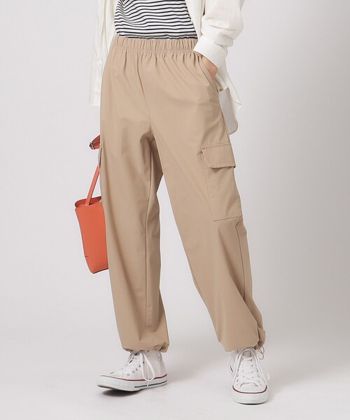 【デザイン】軽くて、接触冷感機能のある素材でサラッとした穿き心地。程よいサイズ感とウエストゴム仕様で着心地が良く、動きやすいカーゴパンツです。アクセントになるフラップ付きのデザインがポイント。裾のドロストデザインは、きゅっと絞ればシルエットや丈感を簡単に調節できます。※ポケット数:横×4 後飾りポケット×2【スタイリング】カットソーと合わせた定番カジュアルコーデはもちろん、女性らしいブラウスと合わせれば、こなれた印象になります。【お客様からいただいたコメント】・細見えします。涼しくて夏にもいい。 (身長:155cm 体型:ふっくら ブラックのLサイズ購入)・生地がサラサラしててひんやり冷たくて、これからのシーズン穿くのに良い。 (身長:158cm 体型:普通 ブラックのMサイズ購入) とのお声も頂戴しております。【素材】触れた瞬間ひんやりする接触冷感素材。ストレッチ性があり、動きやすく、夏でも穿きやすいです。※裏地なし※照明の関係により、実際よりも色味が違って見える場合があります。また、パソコン・スマートフォンなどの環境により、若干製品と画像のカラーが異なる場合もございます。モデル情報:身長164cm B78 W56 H80 着用サイズ:02(M)店舗へのお問い合わせ商品番号:C62-68012●製品寸法:02(M):W~78cm H102cm 股下66cm 前股上28cm 渡り幅32cm 裾幅24cm03(L):W~82cm H104cm 股下66cm 前股上28cm 渡り幅33cm 裾幅24cm04(LL):W~86cm H106cm 股下67cm 前股上29cm 渡り幅34cm 裾幅25cm備考: