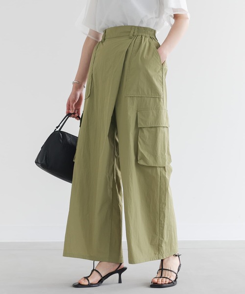 ■デザインカシュクールデザインが着こなしにひと癖プラスするカーゴワイドパンツ。膝上まで裏地が付いており、透け感や張り付きを気にすることなく穿いていただけます。ウエストはゴム入りで快適な穿き心地。しっかり4ポケットが付いており、実用性も◎立体ポケットがアクセントになった一枚です。■素材シャカシャカとした質感の、ハリのある薄手の生地。軽い穿き心地で、乾きやすくお手入れもしやすい素材です。膝上まで付いた裏地は滑りの良いカットソー生地です。■コーディネートシンプルなデザインで、Tシャツなどに合わせてデイリーに着回していただけます。後ろゴム仕様のウエストベルトでトップスをインしてもすっきりとご着用いただけます。