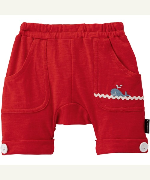 左ポケットの波を表現したテープとくじら刺しゅうがユーモラス。夏のデイリーウェアとして活躍しそうな、ショートラップパンツです。裾の白の飾りボタンで、マリンテイストをプラスしました。はっきりとした色使いも着こなしのポイントになって、元気いっぱいなキッズにぴったり。さらっと肌に心地よい薄手の綿100%スラブ天竺素材を使用しています。