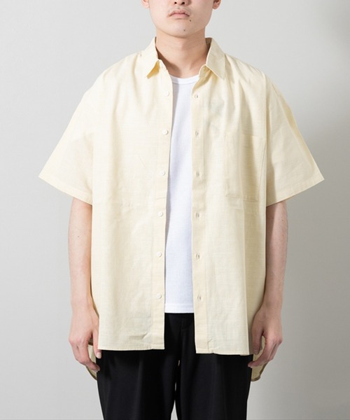 ルーズなサイズ感で1枚でも映えるオーバーサイズシャンブレー半袖シャツ。シンプルで使い勝手のいいアイテム。一つ持っておくと便利な一着です。プチプライスなのも嬉しいポイントです。●生地はコットン100%のサラッとしたシャリ感のあるシャンブレー生地●胸には実用性の高いポケットを配置●後ろ身頃を長くとったロング丈仕様●シルエットはオーバーサイズのルーズシルエット●シンプルなデザインは様々なスタイリングに落とし込みやすく、メンズだけでなく、レディースでも着られるジェンダーレスに仕上げた1着