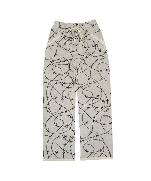 有刺鉄線のワイヤーがデザインされた総柄パンツ ニット素材が用いられ、ラフな履き心地◎ A,ベージュ B,ブラック