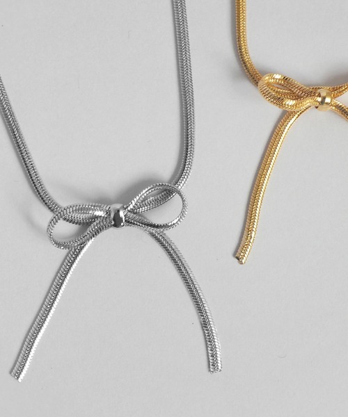 [ SS2024 / minia ] ゆれるリボンが大人かわいいネックレス 胸元を彩る垢抜けアイテム いつでも気になるリボンモチーフ。 今またさらに注目度がアップしていて、 コーデに取り入れるだけで今っぽスタイルに。 ガーリーなイメージがあるリボンモチーフも、 メタリックなアクセサリーなら大人っぽく仕上がるから いろんなスタイリングに合わせられます。 5cmのアジャスターで長さ調節できるので、 気分に合わせてお使いいただけます。 ----------------- ・シルバー ・ゴールド ----------------- ●リボンサイズ…(幅)約2.5×(縦)約3.5cm ●全長…約44cm ●アジャスター部分…約5cm ----------------- minia/ミニア いつものコーデにプラスするだけでトレンド感がUPするようなアイテムを提案。結婚式やパーティ・二次会などオケージョンシーンや通勤・オフィスカジュアルでも使えるシンプル上品なアイテムから、普段のおでかけ・通学でデイリーに使えるカジュアルな定番アイテムまで幅広くラインナップ。 靴・バッグをはじめ、イヤリング・ピアス・ネックレス・ヘアゴムなどのアクセサリー/ヘアアクセサリーなど、韓国ファッションで人気のアクセ・雑貨も取り扱っています。プレゼント/贈り物/お返しにもぴったり。 試しやすいプチプライス~素材や機能性にこだわったアイテムもご用意。また、靴箱に再生紙を使用するなど環境に配慮したサステナブルなものづくりに取り組んでいます。姉妹ブランドに『alala』『Una gardenia』『Hercheek』。 ※お使いのモニターや閲覧環境により、実際の色味と違って見える場合がございます。 ※製作・輸送時に発生した微細なキズがみられる場合がございます。 ※使用素材の特性上、パーツの形や色味など僅かな個体差があり、左右でもばらつきが見られます。 これらは不良の対象外となりますので、予めご了承くださいませ。