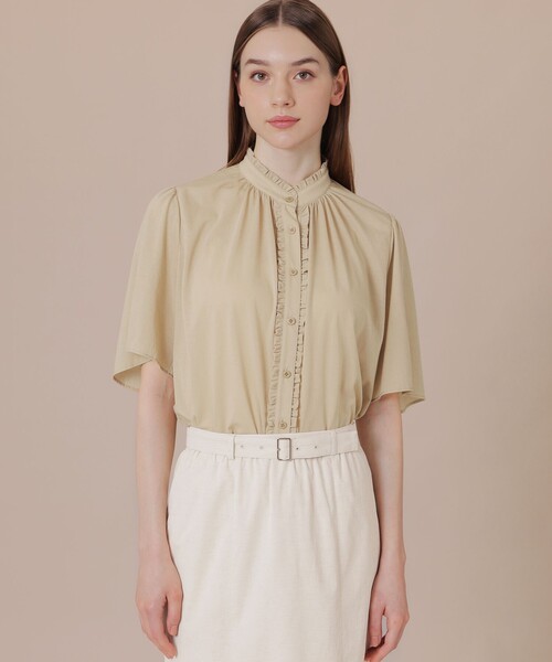 【ウォッシャブル】【着用推奨シーズン:春・夏】 <素材説明> 細番手の綿にナイロンをカバーリングした糸を使用し、ハリ感とシアー感を表現した素材です。適度なハリ感がありながら肌触りの良さも特徴です。 <デザインポイント> 繊細なフリルに前衿ぐりと後ヨークのギャザーがやさしい印象のテールカットブラウスです。また、フレアースリーブは後側を長く丈に差を付け、肘を隠しながら腕が動かしやすいデザインです。